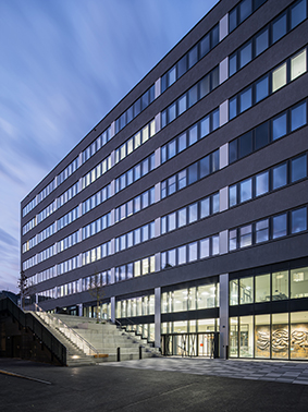In einem zweiten Schritt erfolgte die Umwandlung des ehemaligen, nicht mehr zeitgemäßen Laborgebäudes mit knapp 7.000 Quadratmeter Nutzfläche in ein modernes Büro- und Hörsaalzentrum. Im Zuge dessen wurde die alte Fassade abgenommen und durch ein hochwärmegedämmtes Aluminiumverbundfenstersystem ersetzt, das auf neuen Brüstungen aus Stahlbetonfertigteilen platziert ist. Ferner wurde das Dachgeschoss abgerissen und vollkommen neu aufgebaut. Durch diverse bauliche Maßnahmen wie z. B. die Verlegung der Außenwandkonstruktion vor die Tragwerkstruktur konnten zusätzliche 1.300 Quadratmeter für Lehre und Forschung gewonnen werden. „In Spitzenzeiten werden bis zu 1.200 Studierende sowie 180 Mitarbeitende die neuen von GSSG Architektur geplanten Räumlichkeiten nutzen, was durch die zusätzlich gewonnene Fläche kein Problem mehr darstellt“, so Maximilian Pammer. Durch die Erweiterung wurde es außerdem möglich, die bisher auf elf verschiedene Standorte in Innsbruck verteilte Verwaltung in einem einzigen Gebäude zusammenzuführen.