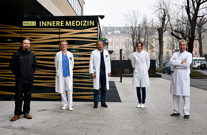 Bild: Das Innsbrucker Studienteam, v.l.: Erstautor Piotr Tymoszuk, die Studienleiter:innen Judith Löffler-Ragg und Raimund Helbok, Erstautorin Sabina Sahanic und Klinikdirektor Günter Weiss. (c)MUI/Bullock