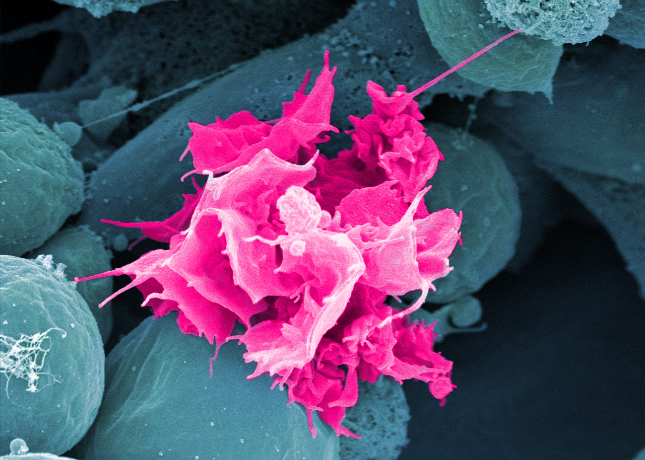 Das Bild aus dem Rasterelektronenmikroskop zeigt eine Langerhanszelle (pink) bei der Auswanderung aus der Epidermis zu den Lymphknoten in 15.000facher Vergrößerung. (Copyright: P. Stoitzner/K. Pfaller.)