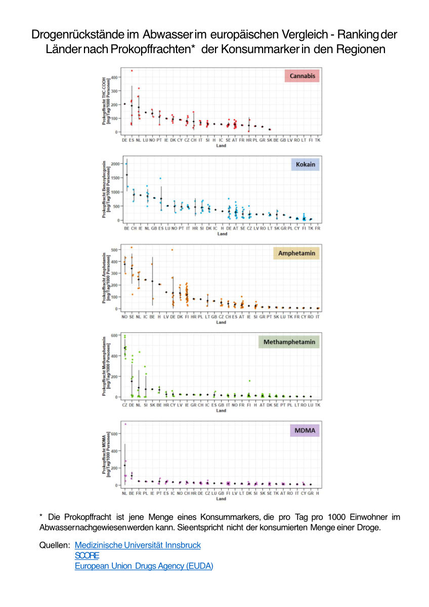Innsbruck, am 18. März 2025:  Um Vergleichswerte und Trends des Drogenkonsums über Ländergrenzen hinweg feststellen zu können, wird das abwasserbasierte Drogenmonitoring in europäischen Städten schon seit Jahren erfolgreich eingesetzt. Die Abwasseranalysen liefern wichtige Informationen für die Lagebeurteilung, auf Basis derer gesundheitspolitische Strategien erarbeitet, evaluiert und angepasst werden können.