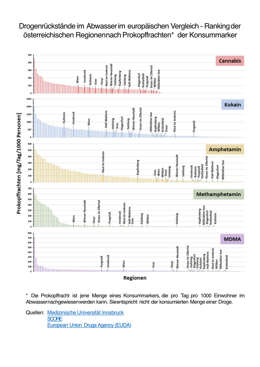 „Eine Einwohnerin bzw. ein Einwohner aus einer der 17 untersuchten Regionen in Österreich trinkt im Schnitt täglich etwas mehr als ein Glas Wein, raucht 3 bis 4 Zigaretten und konsumiert 0,07 Joints sowie rund 1,5 Milligramm an aufputschenden Drogen“, veranschaulicht Chemiker Herbert Oberacher die Ergebnisse der Abwasseranalyse für Österreich. Auch 2024 findet sich keine einzige der in Österreich und Südtirol überwachten Regionen unter den zehn umsatzstärksten Regionen Europas.