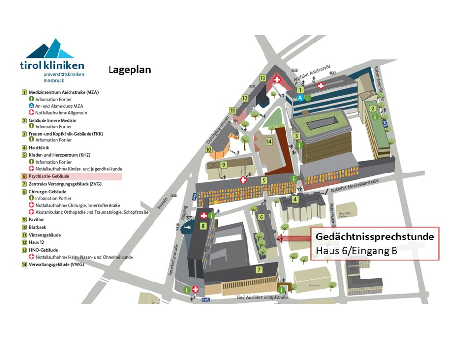 Klinik Innsbruck, Haus 6, Gedächtnissprechstunde, Eingang B – Anmeldung: EG Psychiatrie Ambulanz