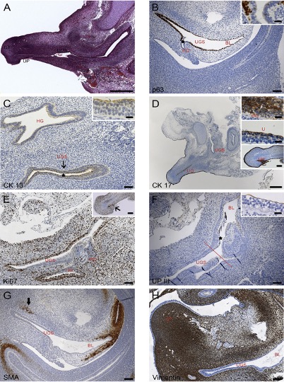 Furthermore, the urogenital sinus epithelium provides the Wolffian duct with p63-positive cells, leading to the suggestion that development of the male inner genitals requires a cellular stimulus by the UGS. CK 17 positive cells, which were described as stem cells in previous studies, were found in the urethral plate, the precursor of the distal urethral tube.