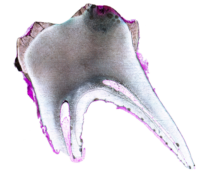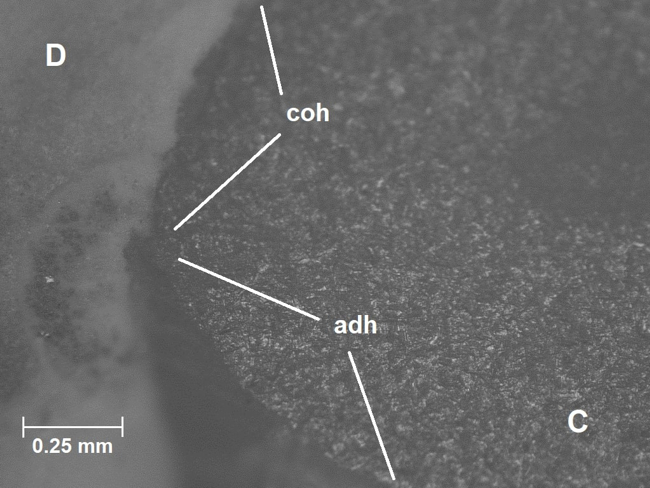 The choice of adhesive system and composite resin has an impact on the clinical success of composite restoration and must be made carefully. Because of this, we started a series of in vitro investigations, measuring the push-out bond strength of various composites on dentine, by means of single and multi-stage adhesive systems. We were able to detect that fluid composites display higher push-out bond strengths than universal and bulk-fill composites – a surprising finding, since fluid composites comprise fewer and smaller fillers than universal and bulk-fill composites. Further, we demonstrated that multi-stage adhesives have greater bond strengths than single-stage adhesives; this is an important statement, which contradicts the common belief of dental practitioners in the industry suggestion of using single-stage adhesives for reasons of time saving. In a second step, we analysed the fracture types of the composite at the dentine-composite interface (Fig. 1). Fluid composites showed predominantly mixed, whereas universal and bulk-fill composites showed adhesive failure types. In conclusion, we can state that fluid composites should become increasingly significant as restoration materials, especially in cavity lining, owing to their excellent wetting properties and high bond strength on dentine.