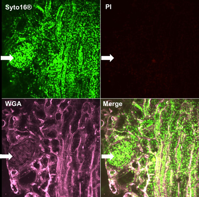 - Weissenbacher A, Oberhuber R, Hermann M, Soleiman A, Ulmer H, Mayer G, Margreiter C, Maglione M, Bösmüller C, Messner F, Resch T, Cardini B, Troppmair J, Margreiter R, Öfner D, Schneeberger S. Live Confocal Tissue Assessment With SYTO16/PI and WGA Staining Visualizes Acute Organ Damage and Predicts Delayed Graft Function in Kidney Transplantation. Ann Surg. 2019 Nov;270(5):915-22