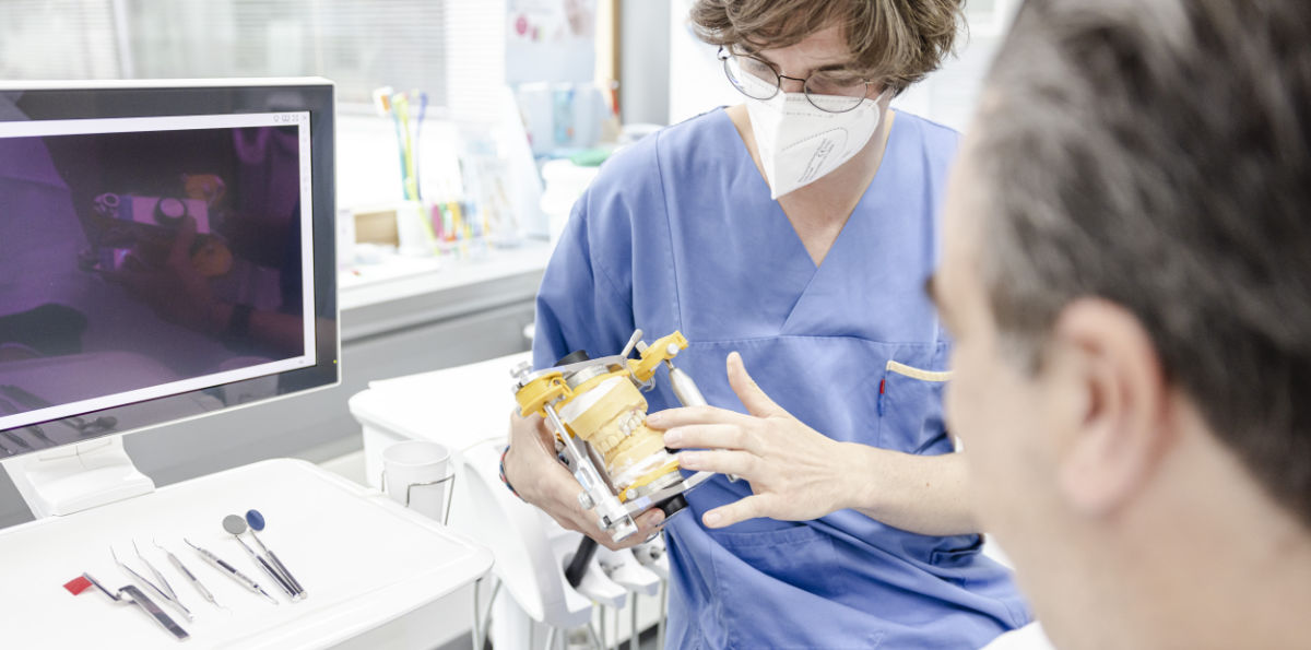 Für die Behandlung verspannter Kaumuskeln werden in unserer Klinik Aufbissschienen aus Kunststoff eingesetzt, die nachts getragen werden. Diese verhindern zudem Verschleiß der Zähne durch nächtliches Knirschen.