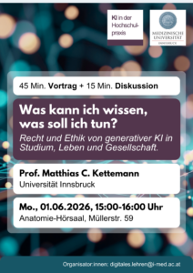 As part of the lecture series “AI in Higher Education Practice”, selected aspects of artificial intelligence relevant to our university, research, teaching, and administration will be presented and discussed with a practical focus.