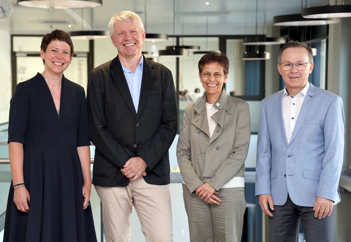 The Presidential Team of the Medical University of Innsbruck (from left): Vice President for Research and International Relations Univ.-Prof.in Dr.in Patrizia Stoitzner, President Univ.-Prof. Dr. Gert Mayer, Executive Vice President for Digitalization, Finance and Sustainability Mag.a Dr.in Irene Häntschel-Erhart and Executive Vice President for Teaching and Academic Affairs ao. Univ.-Prof. Dr. Wolfgang Prodinger, MME. (c) MUI/D. Bullock